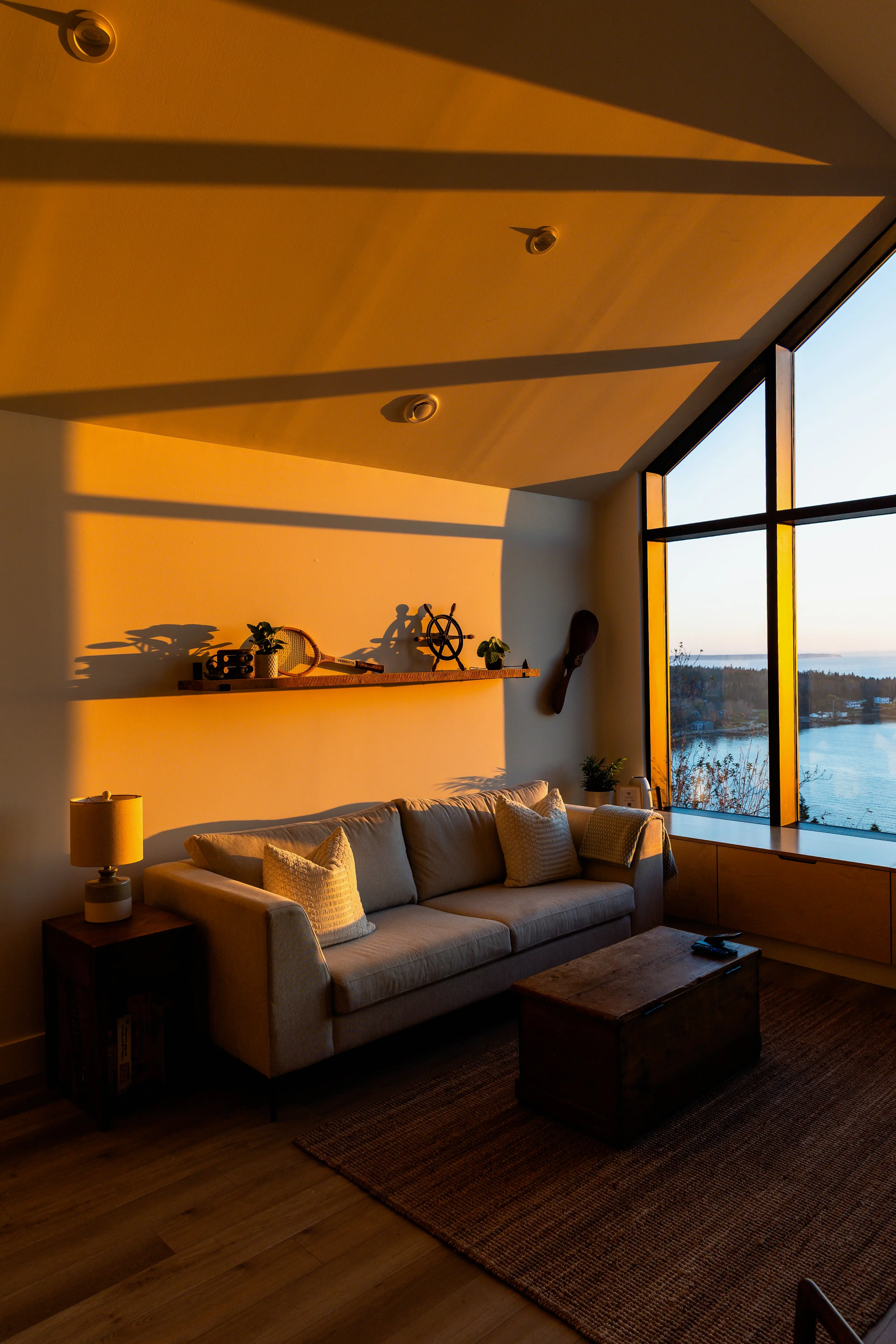 The simple design offers two bedrooms, a full-sized bathroom, and an open-plan living, dining, and kitchen area. The living and dining space boasts floor-to-ceiling ocean views, a propane stove for chilly days, and an inviting full-length window seat, perfect for daydreamers and avid readers. For those who prefer a duvet day on the couch, there's also a flat-screen TV, high-speed Wi-Fi and a quality sound bar for entertainment.